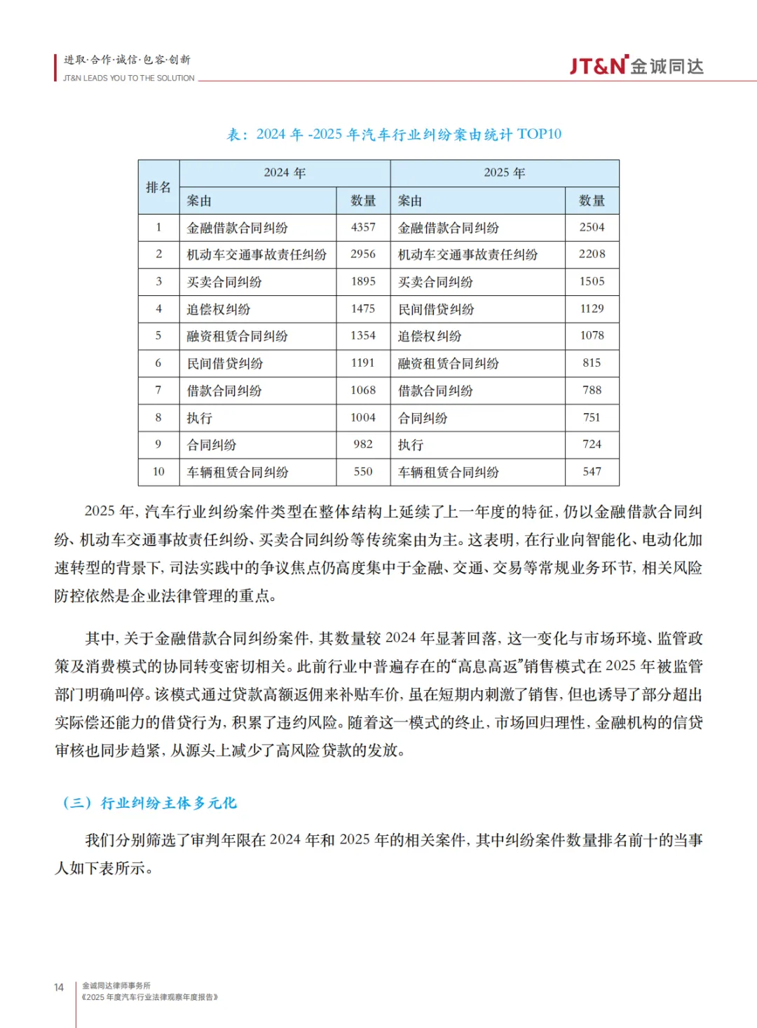 :金融借款合同纠纷、机动车交通事故责任纠纷、买卖合同纠纷稳居案由前三,其中金融借款合同纠纷因 “高息高返” 模式被叫停,案件量显著回落。 - 纠纷主体多元化