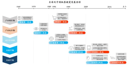 伴随着核心技术的不断突破以及制造业的转型升级,工业机器视觉的应用领域不断拓宽,全球及中国机器视觉发展历程如下图所示: