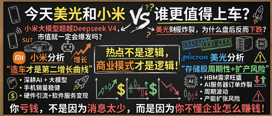 很多人这两天都在问我两个问题:第一个,小米大模型如果真的超越了 DeepSeek V4,这是不是意味着小米的市值会借此大模型重新爆发上涨;第二个,美光财报这么炸裂,为什么盘后反而跌了,今天这个位置还能不能追?