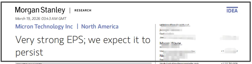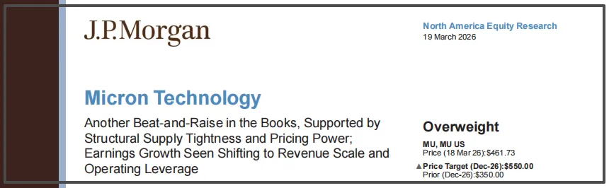美光科技(Micron Technology)发布了FY26 Q2财报,数据用"炸裂"来形容不过分。紧接着,摩根士丹利和摩根大通几乎同时更新了研报,都给了增持评级,但看好的角度和估值逻辑完全不同。今天把两份报告放在一起,拆解一下两家的核心思路和分歧。
