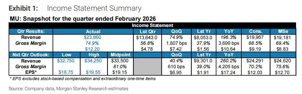 但更让市场震动的是指引。下个季度(May-Qtr)收入指引$33.5B,毛利率指引81%,EPS指引$19.15。摩根大通的报告里说得很直白:美光单个季度的收入,已经超过了FY24全年的收入。