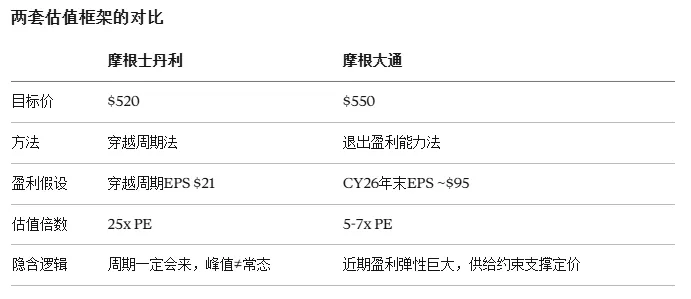 第一是关于盈利的持续性。摩根士丹利更关注"这能持续多久",承认周期性终究会回来,所以用穿越周期法(through-cycle)去估值——假设峰值EPS约$80,三年一个峰值年,穿越周期平均EPS约$21,给25x PE,得出$520。摩根大通更关注"接下来靠什么驱动",他们认为毛利率可能见顶了,但收入规模和运营杠杆能接力,用退出盈利能力法——CY26年末EPS约$95,给5-7x中周期PE,得出$550。