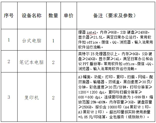 (二)产品要求:1.台式电脑:满足日常办公运行,输入法常用软件运行流畅;2. 笔记本电脑:满足日常办公运行,输入法常用软件运行流畅;3. 复印机:打印、复印、扫描、双面器、输稿器、网络,含每月10000印,全包服务。调研明细: