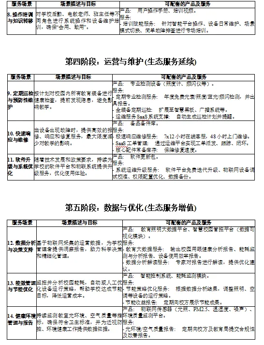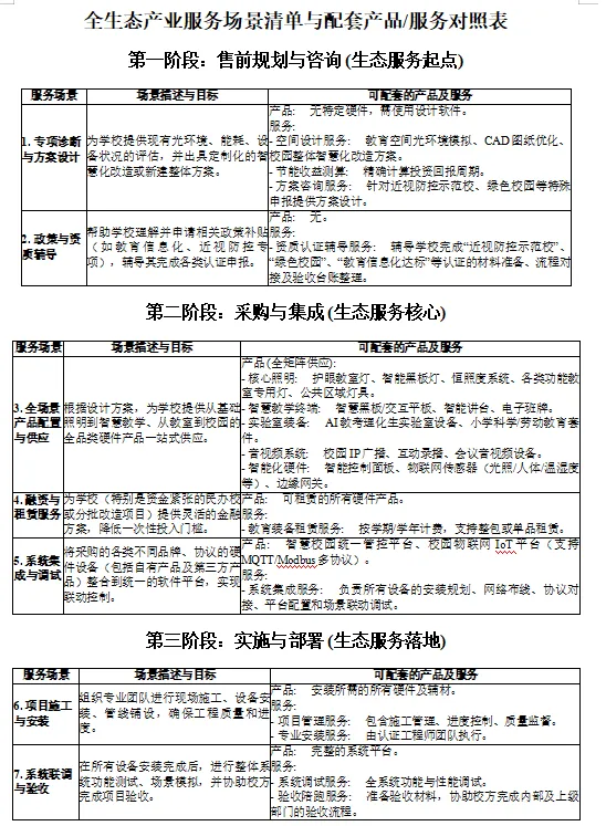 本项目聚焦校园后勤管理与教育装备应用全场景,打造“硬件+软件+数据+服务+金融”五位一体的全生态运营模式,覆盖售前规划、采购集成、实施部署、运营维护、数据优化、生态扩展六大阶段,为K12学校、职业院校、高校提供从空间诊断、方案设计、设备供应、安装调试到长期运维、数据赋能、政策辅导的一站式综合服务,构建校园智慧空间闭环服务体系。