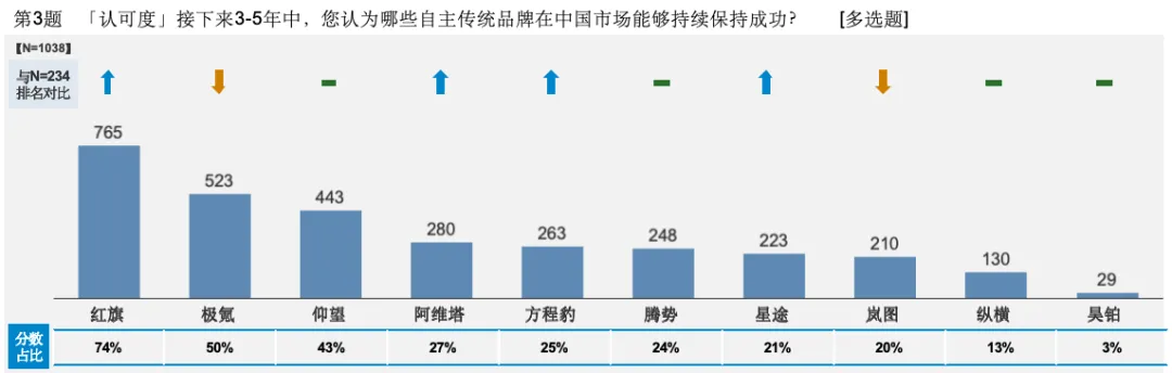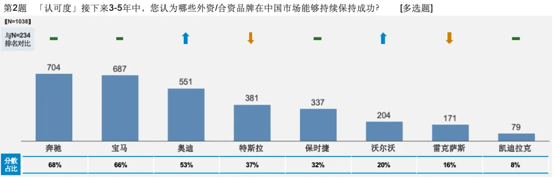 与第一个问题中“现在谁是高端品牌”的调研结果不同,当问题转向长期视角,聚焦“未来谁还能成功”的话题时,开始变得有意思了。被调研的部分消费者普遍认为,未来3-5年最难撼动的仍然是奔驰、宝马、奥迪,说明历史沉淀仍然是消费者眼中“活得长久”的重要判断依据。紧跟BBA的则是特斯拉和保时捷,而其余二线豪华品牌声量更加微弱。这反映出的事实是,特斯拉虽然销量较高,但未来被替代的可能性较大,至于传统二线豪华品牌,如果没有突破性的历史性改革,那么将难以改变在市场中的占位。高端品牌在用户心智中站位的权重,可能在某种程度上决定了其在中国市场到底能走多远?值得一提的是,特斯拉是被部分调研用户看好的外资品牌里唯一一个只提供纯电产品的新能源汽车品牌。而BBA和保时捷为首的头部阵营依然被“看好”,说明市场和用户依然期待并给后者在转型新能源赛道上“抱有期待”。