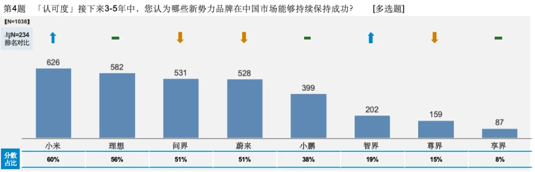 如果说传统自主豪华品牌的未来成功预期较为分散,那么新势力品牌则已经呈现出明确的内部梯队。小米、理想、问界、蔚来都以50%以上的调研分数(受调研用户中超过一半人看好其未来发展)占比自动成立第一阵营,其中小米以60%的分数占比实现领跑。这些品牌之间虽然竞争激烈,但是表现出了整体领先优势,而像小鹏、智界、尊界和享界等后续品牌已被拉开差距。这跟当下新势力玩家的品牌发展分化、包括鸿蒙智行“五界”品牌发展整体呈现不均衡的现状相当“吻合”。但也从另一个侧面佐证了,新势力玩家所在的智能新能源市场反而是更有机会打磨出高端品牌“确定预期”的市场,从数据结果看,并未造成混战局面,而是快速形成了“多头竞争格局”,说明市场认知是高度统一的。