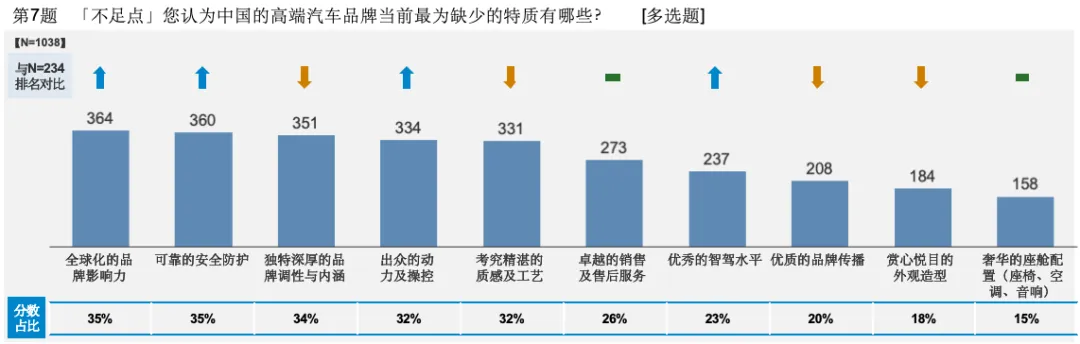 更多消费者认为,中国高端品牌当前短板主要集中在品牌影响力和独特的品牌调性上,由于品牌叙事较为薄弱,还未完全建立起市场对品牌的价值认同体系,导致心智占位不稳。一句话,大多数中国现有的高端汽车品牌都没有“活出自己的精彩”。但与此同时,在辅助驾驶、设计与座舱体验等新维度,中国品牌虽然已建立一定技术领先优势。但在产品体验上的同质化却如影随形。也就是说,中国品牌并不缺技术,而是缺时间去打磨品牌形象、差异品牌定位和丰富品牌内涵。作为企业可持续发展的“软性支撑”,如何将现有的汽车品牌晋级高端化这是一份看上去轻松,实则并不简单的长期课题,需要提起重视,认真对待。尤其是那些只为在技术和配置上堆料、一味认定只要智驾或智舱强大,就一定会在后续竞争中“脱颖而出”的中国品牌,跟当下用户对高端品牌差异化的期待,完全是背道而驰的。