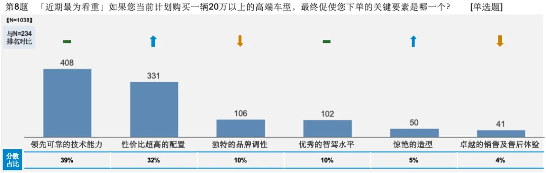 当问题最终落到20万高端车型的真实购买决策层面,调研结果非常理性且集中,技术实力与配置价值作为最核心的因素,两者合计占比接近七成。相比之下,品牌调性、造型设计或服务体验虽然重要,但却难以单独成为成交决定项。对此可以给出的判断是,产品的硬实力和显性价值超越了品牌故事和单一体验点,只有顶尖的技术和扎实的配置,才是实现销售转化的关键利器。在这方面,独有的硬核技术与完全潮流化甚至同质化的技术,给到高端市场用户的实际体验和“情绪价值”,二者是不可同日而语的。而这一结论性的指引,也为豪华车企提供了确定的方向,想要赢得市场,首先要让用户站在消费鄙视链的顶端,通过前期对用户需求的洞察并结合其独有的产品、技术解决方案,响应用户心中最挑剔的价值偏好。对照之下,那种以为只要造一台既好看又便宜、靠“心有灵犀”的致敬经典设计获得短期曝光,但却堆砌了一堆华而不实科技的所谓“高端车”,就算能“火”一阵子但终究抵不过时间对“高端品牌”的长期考验。符合用户对真正高端产品的全维度审视,才是促使后者“下单”的正解。/ 写在最后 /