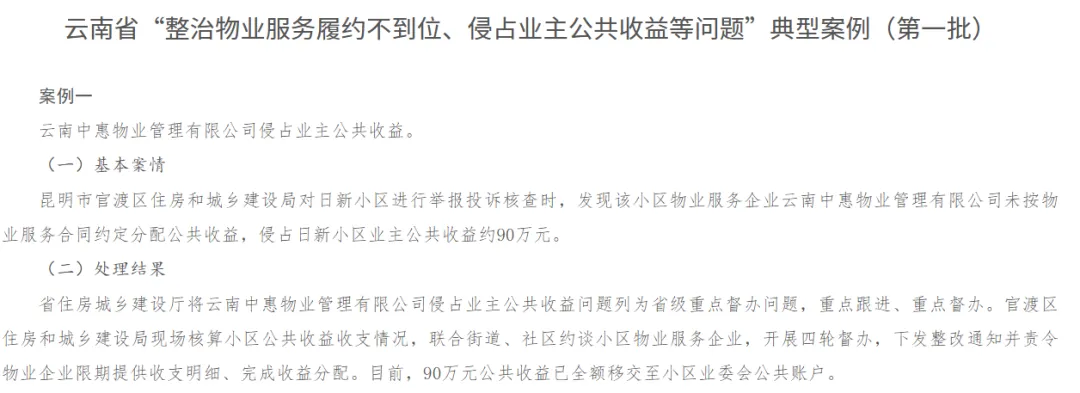 一是部分物业服务企业未严格履行合同约定,成为负面评价产生的直接诱因。以云南省昆明市日新小区为例,其物业服务企业未按合同约定分配公共收益,侵占业主公共收益约90万元,后经主管部门督办整改,该笔款项已全额移交至小区业主委员会公共账户。这一事件在当地引发广泛关注,反映出部分物业服务企业管理不规范、信息不透明的问题。