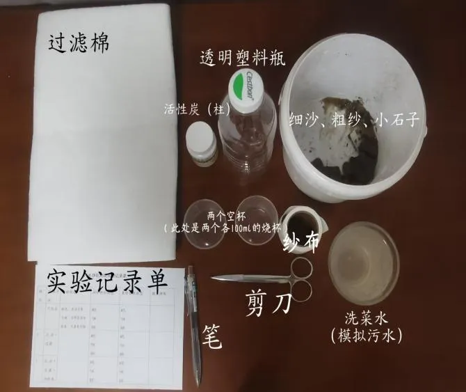 实验材料:透明塑料瓶、过滤棉、活性炭、细沙、粗沙、小石子、两个空杯、纱布、剪刀、洗菜水(模拟污水)、剪刀、笔、记录单等。