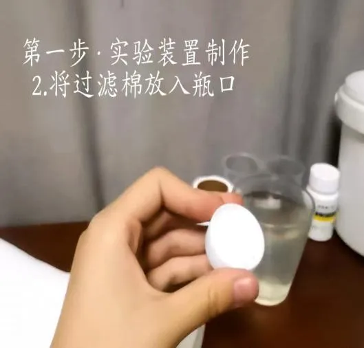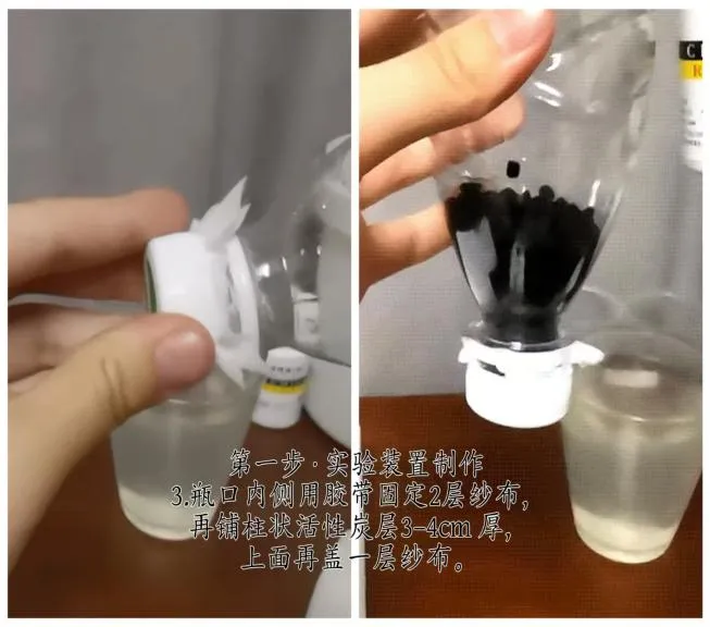 (3)瓶口内测用胶带固定2层纱布,在铺柱状活性炭层3-4cm厚,上面再盖一层纱布。