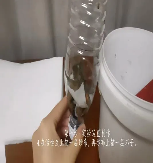 实验方法:取200ml同样的污水,先沉淀30分钟,把装置里的柱状活性炭层去掉。只保留过滤棉、细沙、粗沙、石子,将上层水倒入简易过滤装置,然后缓慢倒入沉淀后的上层污水,用杯子接水。