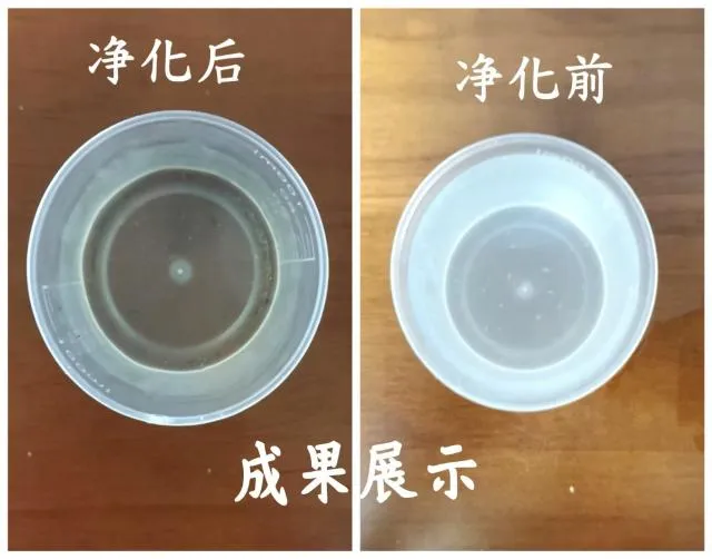 实验方法:取200ml同样污水。先沉淀30分钟。使用完整装置(含柱状活性炭层缓慢倒入污水,接水。将沉淀过滤后的水再通过活性炭层吸附进行处理。