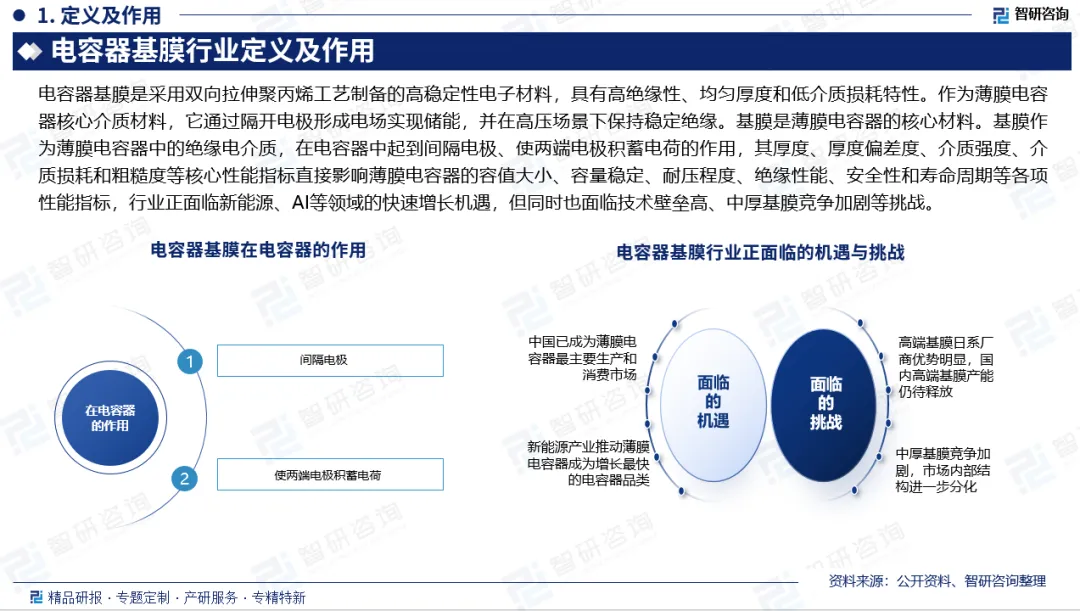 行业面临的机遇与挑战:作为薄膜电容器核心介质材料,它通过隔开电极形成电场实现储能,并在高压场景下保持稳定绝缘。电容器基膜行业正面临新能源、AI等领域的快速增长机遇,但同时也面临技术壁垒高、中厚基膜竞争加剧等挑战。