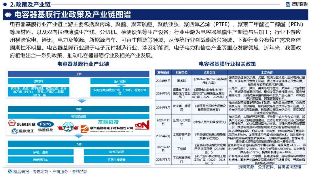 产业链核心节点:电容器基膜行业产业链上游主要包括聚丙烯、聚酯、聚苯硫醚、聚酰亚胺、聚四氟乙烯(PTFE)、聚萘二甲酸乙二醇酯(PEN)等原材料,以及双向拉伸薄膜生产线、分切机、检测设备等生产设备;行业中游为电容器基膜生产制造与后加工;行业下游应用横跨家电、通讯、电力及能源、新能源汽车、可再生能源等领域。