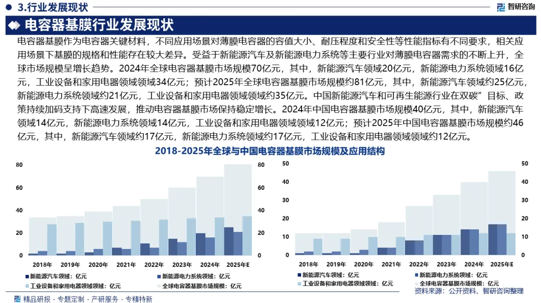 全球市场规模:2024年全球电容器基膜市场规模70亿元,其中,新能源汽车领域20亿元,新能源电力系统领域16亿元,工业设备和家用电器领域领域34亿元;预计2025年,全球电容器基膜市场规模约81亿元,其中,新能源汽车领域约25亿元,新能源电力系统领域约21亿元,工业设备和家用电器领域领域约35亿元。