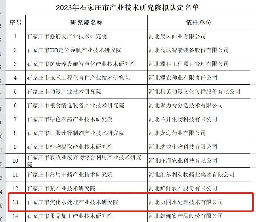 2023年4月14日,石家庄市科技局公示市产业技术研究院拟认定名单,依托河北协同水处理技术有限公司,联合河北省科学院能源研究所、江苏恒旺数字科技有限责任公司、河北尚云信息科技有限公司、微鲸环境(北京)有限公司共同建设的“石家庄市焦化水处理产业技术研究院”被拟认定为市产业技术研究院。2023年7月顺利签订《石家庄市产业技术研究院建设任务书》。