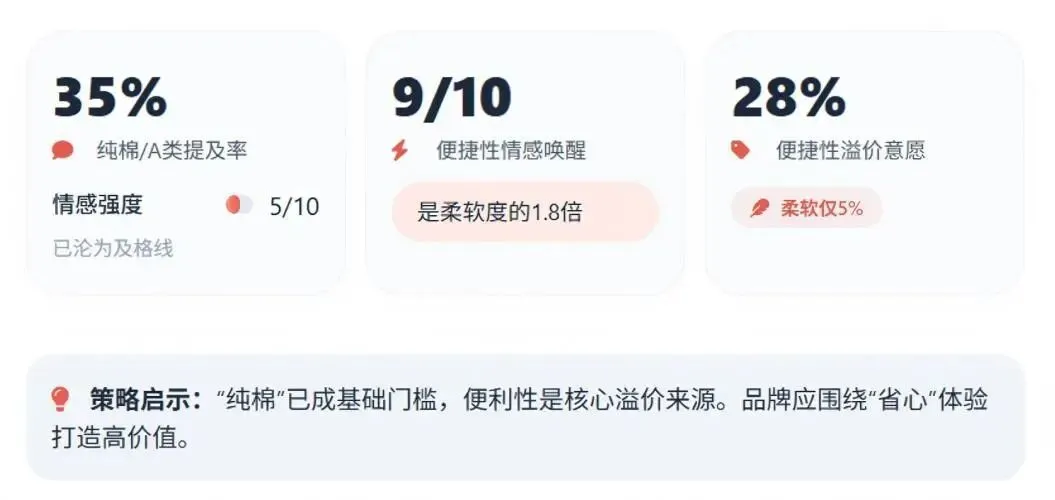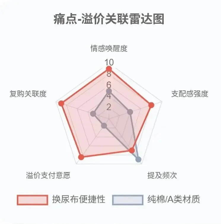 洞察给出了清晰的指向,“换尿布便捷性”的情感唤醒度高达9/10,远高于“面料柔软度”。这表明,消费者愿意为“省心”支付高达28%的溢价,而仅为“柔软”支付5%。妈妈们想要的,可能不仅仅是“亲肤”,更是深夜里能不惊扰宝宝美梦的那一份从容。