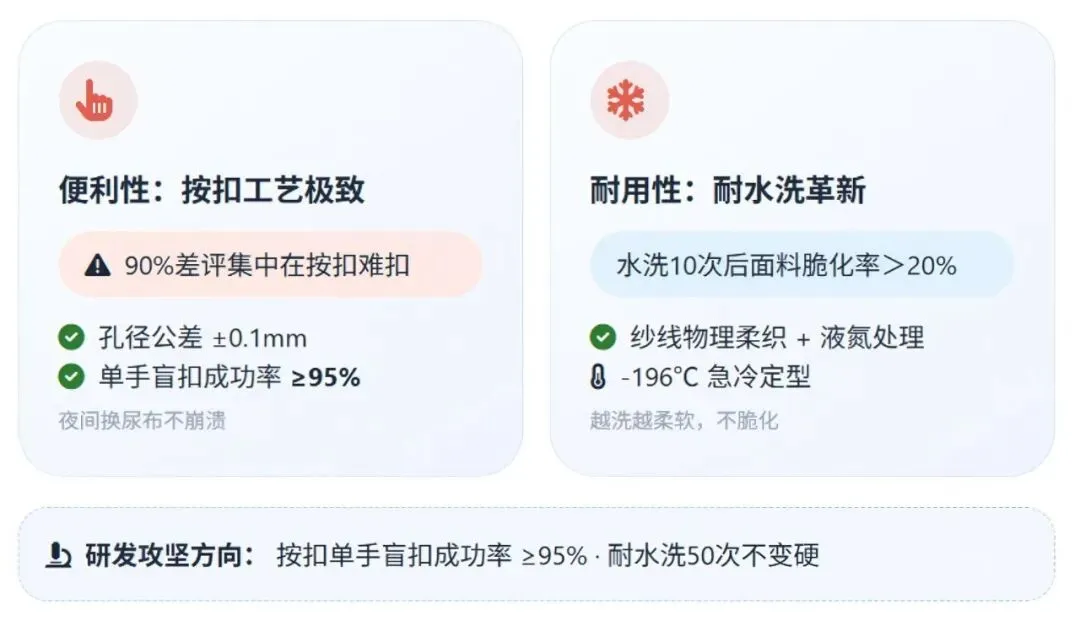 洞察显示,头部品牌已通过工业级的精度管控,将按扣孔径公差控制在±0.1mm以内,确保新手父母“单手盲扣”的成功率在95%以上。而部分品牌为控制成本使用普通按扣(公差±0.3mm),导致使用3个月后按扣松动率高达40%。