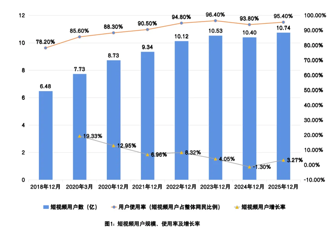 用户规模和使用率筑底回升。数据显示,2018年12月-2023年12月,短视频用户规模从6.48亿增长至10.53亿,使用率也从78.20%攀升至96.40%,尽管用户增长率从19.33%下降到4.05%,但整体上仍保持增长态势。进入2024年,短视频用户规模和使用率却经历了“双降”,至2024年12月用户规模为10.40亿,使用率为93.80%,用户增长率为-1.30%。在经历了短暂下降后,2025年短视频用户规模和使用率又迎来新增长,到2025年12月,短视频用户规模达到新高10.74亿,用户使用率为95.40%,用户增长率为3.27%。