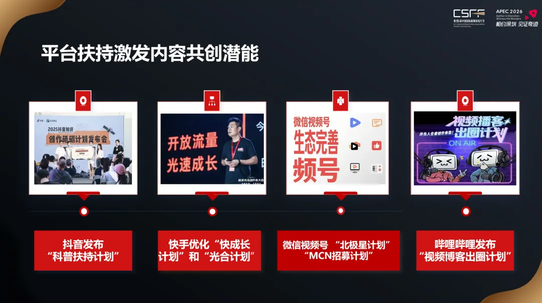 平台扶持激发内容共创潜能。短视频平台持续优化升级各类扶持计划和激励政策,推动平台内容生态向更加多元化、高质量和专业化的方向发展。例如,抖音发布“科普扶持计划”,快手优化“快成长计划”和“光合计划”,微信视频号延续“北极星计划”“MCN招募计划”扶持路径,哔哩哔哩发布“视频博客出圈计划”。