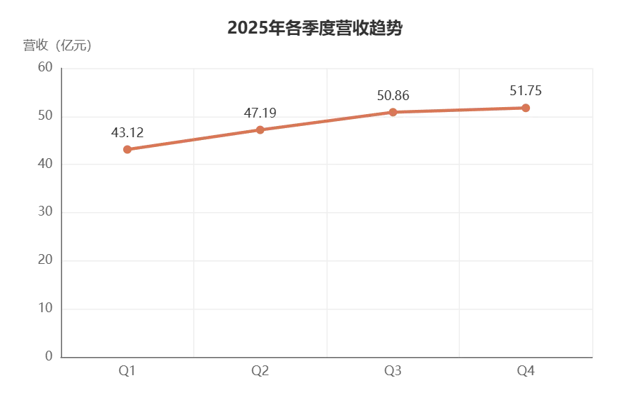 季度数据也印证了增长的持续性。Q1到Q4,营收从43.12亿元稳步攀升到51.75亿元,没有出现大起大落。这说明订单需求是真实的、持续的,不是靠一两笔大单冲出来的业绩。