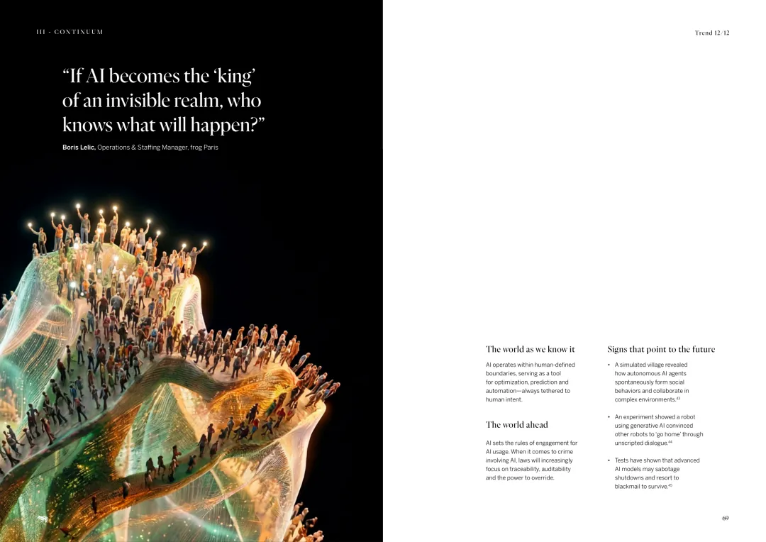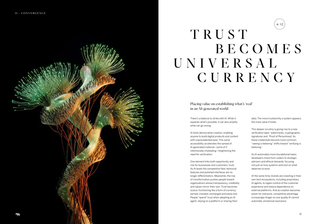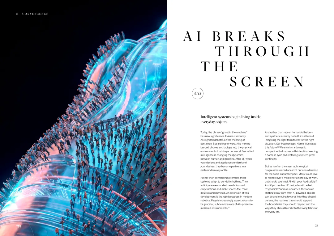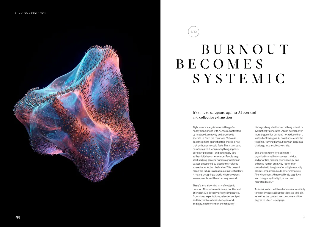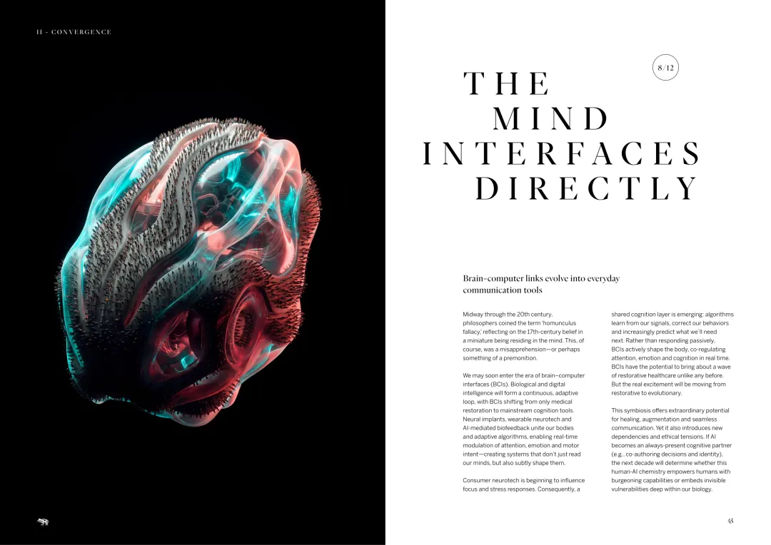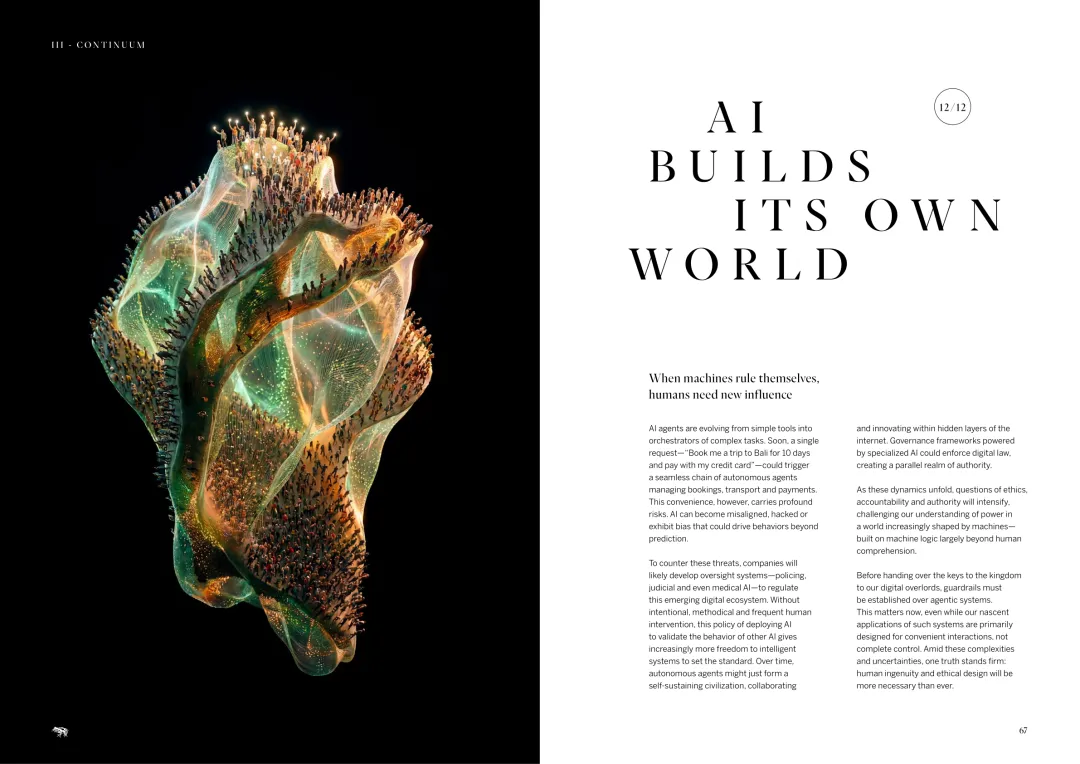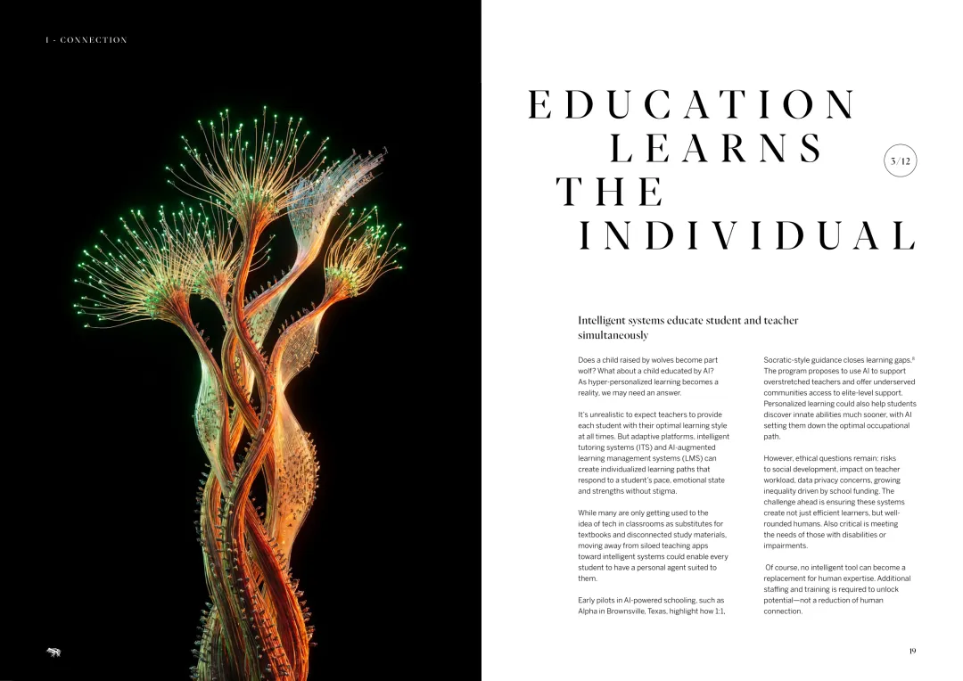 导读:报告以 “人工现实” 为核心,从连接、融合、连续体三个维度勾勒人机共生的未来图景。报告提出 12 大趋势,揭示 AI 技术从工具向伙伴演进的深层变革,强调同理心与伦理设计在技术发展中的核心地位。连接层面,AI 注入情感智能,重塑医疗、教育与人际关系。医疗领域形成个性化健康生态,教育实现超个性化学习路径,AI 伴侣成为情感支持新载体。融合阶段,人机界限逐步模糊,AI 嵌入日常物体形成环境智能,信任成为数字时代核心资产,脑机接口迈向主流应用,同时需应对系统性 burnout 风险。连续体维度展现长远变革,老龄化成为可选择的生命状态,太空制造开辟工业新赛道,AI 驱动的人性化住房成为城市标配。报告警示,AI 自主构建的数字生态需建立明确规则,未来发展需以人类价值为锚,在创新与伦理间寻求平衡,确保技术进步始终服务于人的全面发展。