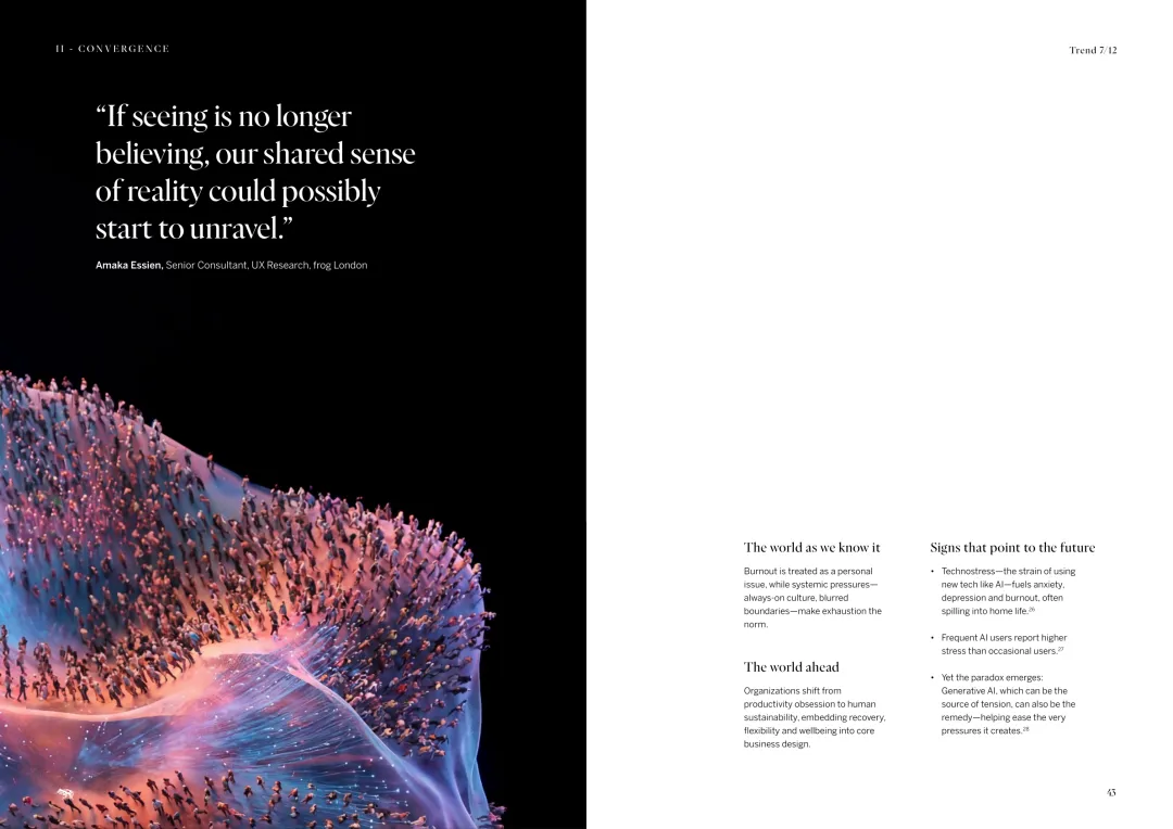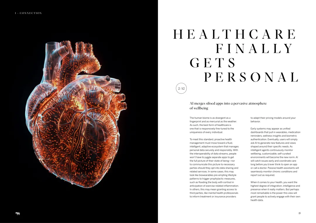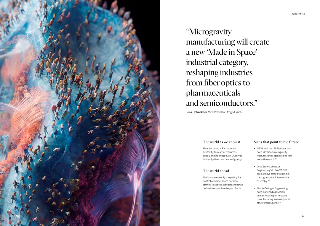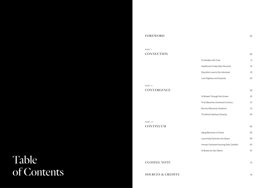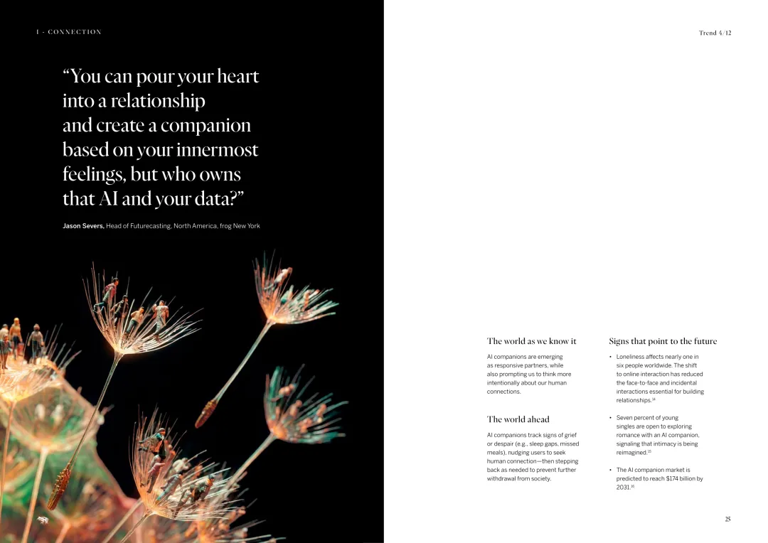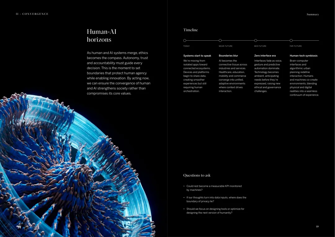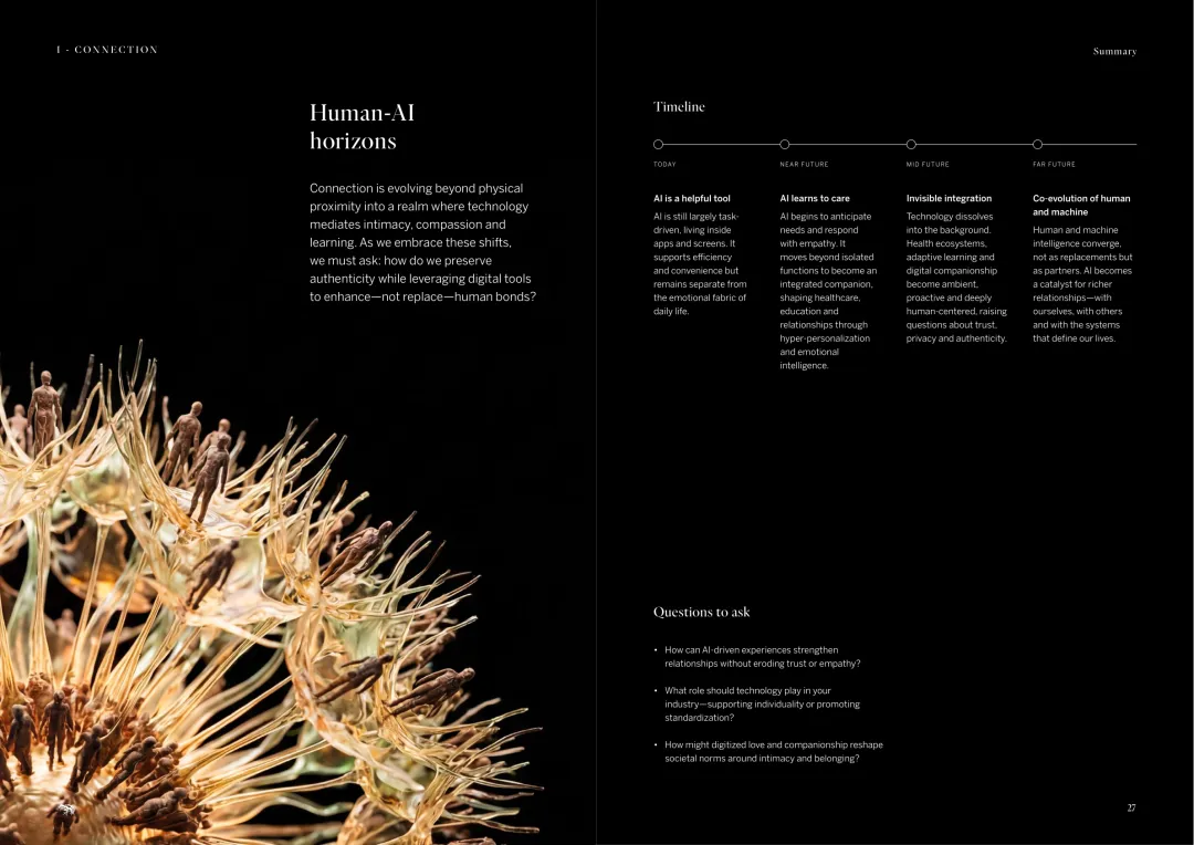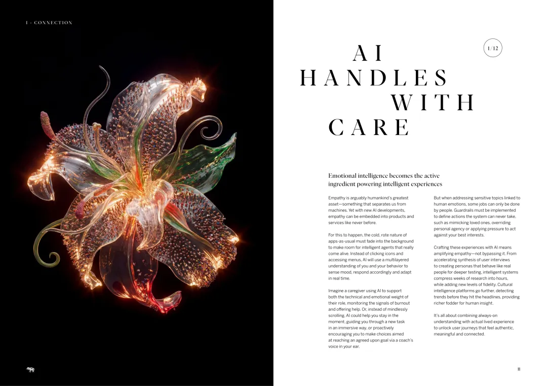 导读:报告以 “人工现实” 为核心,从连接、融合、连续体三个维度勾勒人机共生的未来图景。报告提出 12 大趋势,揭示 AI 技术从工具向伙伴演进的深层变革,强调同理心与伦理设计在技术发展中的核心地位。连接层面,AI 注入情感智能,重塑医疗、教育与人际关系。医疗领域形成个性化健康生态,教育实现超个性化学习路径,AI 伴侣成为情感支持新载体。融合阶段,人机界限逐步模糊,AI 嵌入日常物体形成环境智能,信任成为数字时代核心资产,脑机接口迈向主流应用,同时需应对系统性 burnout 风险。连续体维度展现长远变革,老龄化成为可选择的生命状态,太空制造开辟工业新赛道,AI 驱动的人性化住房成为城市标配。报告警示,AI 自主构建的数字生态需建立明确规则,未来发展需以人类价值为锚,在创新与伦理间寻求平衡,确保技术进步始终服务于人的全面发展。