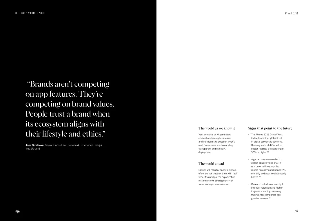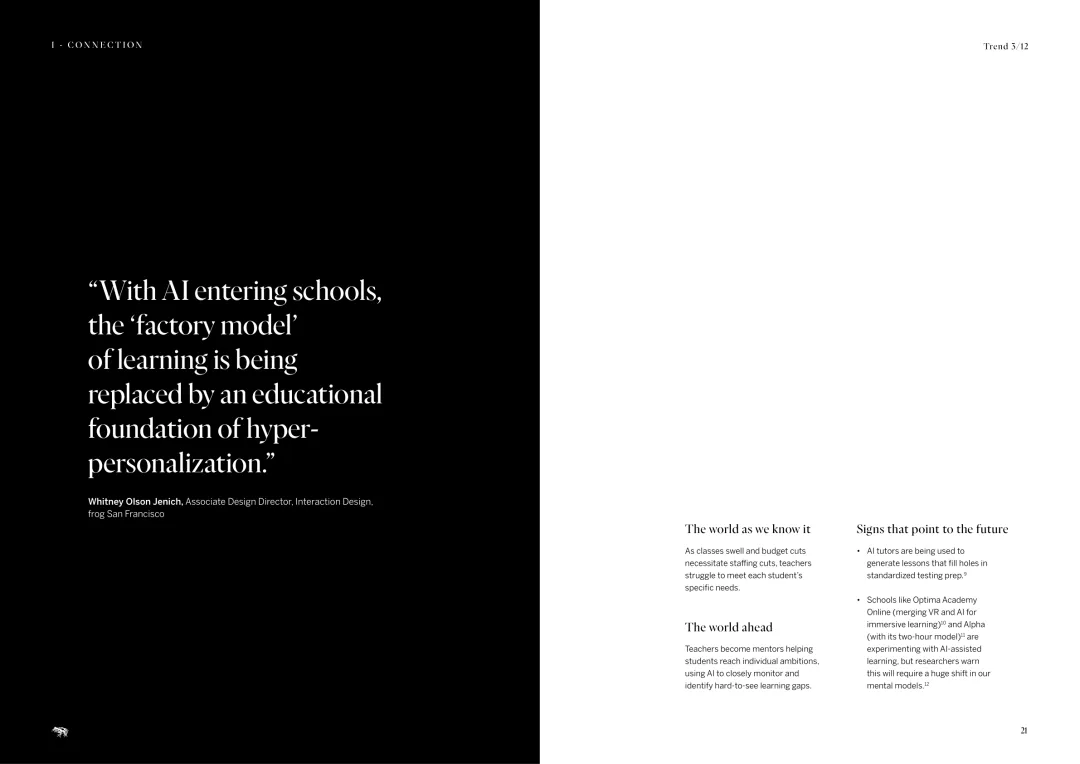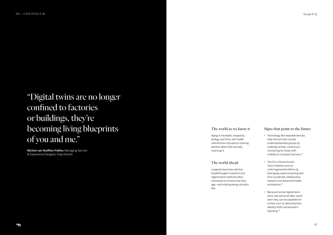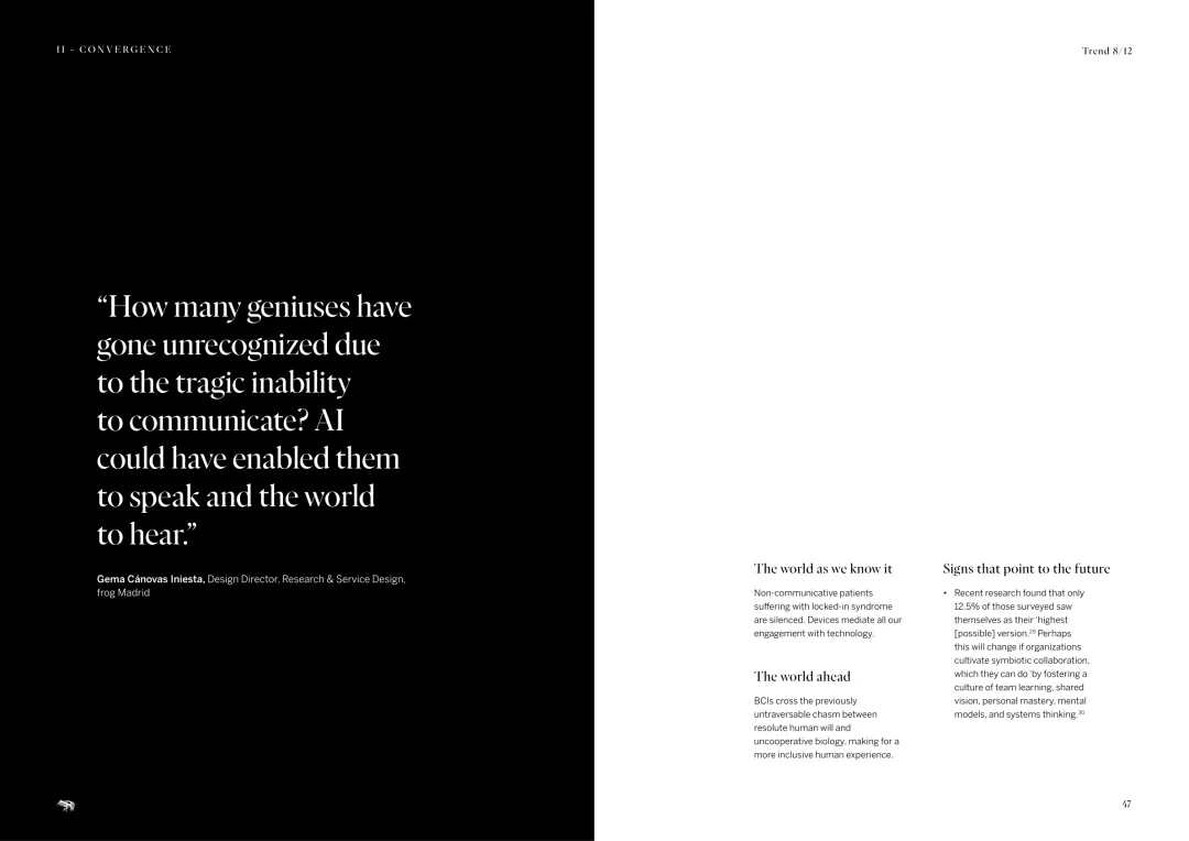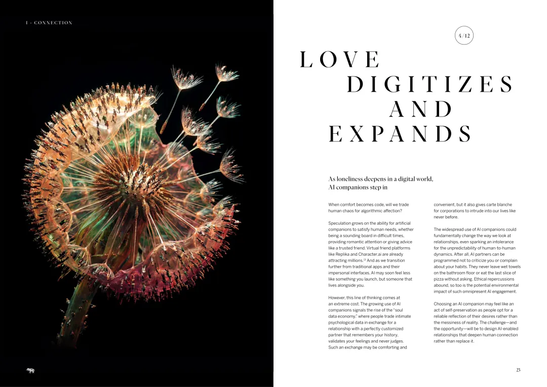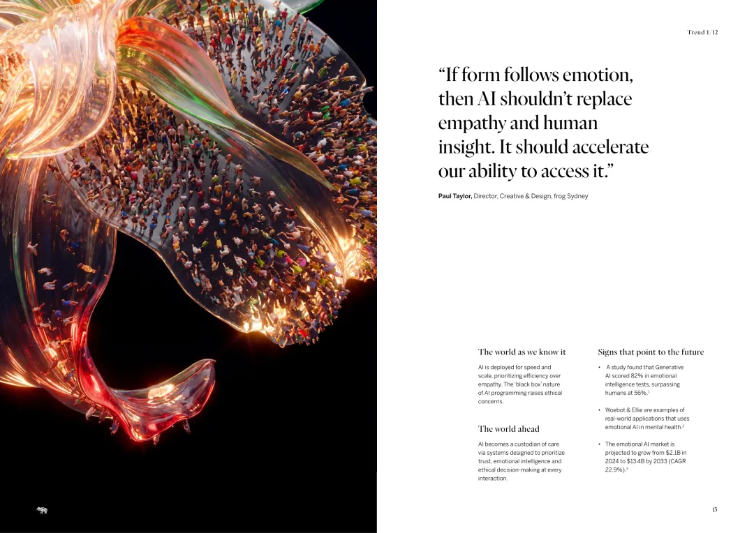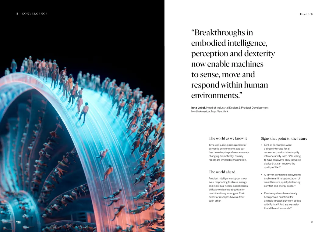 导读:报告以 “人工现实” 为核心,从连接、融合、连续体三个维度勾勒人机共生的未来图景。报告提出 12 大趋势,揭示 AI 技术从工具向伙伴演进的深层变革,强调同理心与伦理设计在技术发展中的核心地位。连接层面,AI 注入情感智能,重塑医疗、教育与人际关系。医疗领域形成个性化健康生态,教育实现超个性化学习路径,AI 伴侣成为情感支持新载体。融合阶段,人机界限逐步模糊,AI 嵌入日常物体形成环境智能,信任成为数字时代核心资产,脑机接口迈向主流应用,同时需应对系统性 burnout 风险。连续体维度展现长远变革,老龄化成为可选择的生命状态,太空制造开辟工业新赛道,AI 驱动的人性化住房成为城市标配。报告警示,AI 自主构建的数字生态需建立明确规则,未来发展需以人类价值为锚,在创新与伦理间寻求平衡,确保技术进步始终服务于人的全面发展。