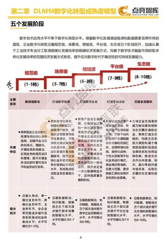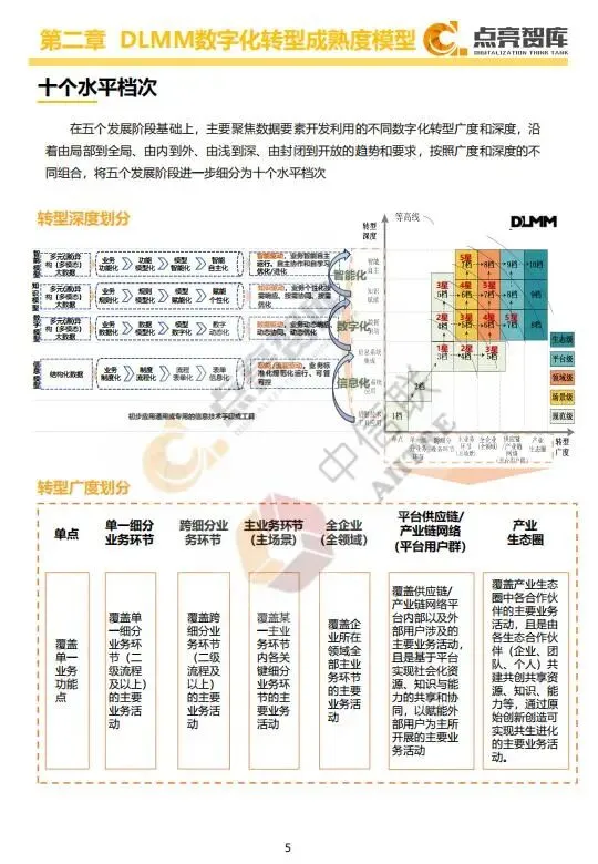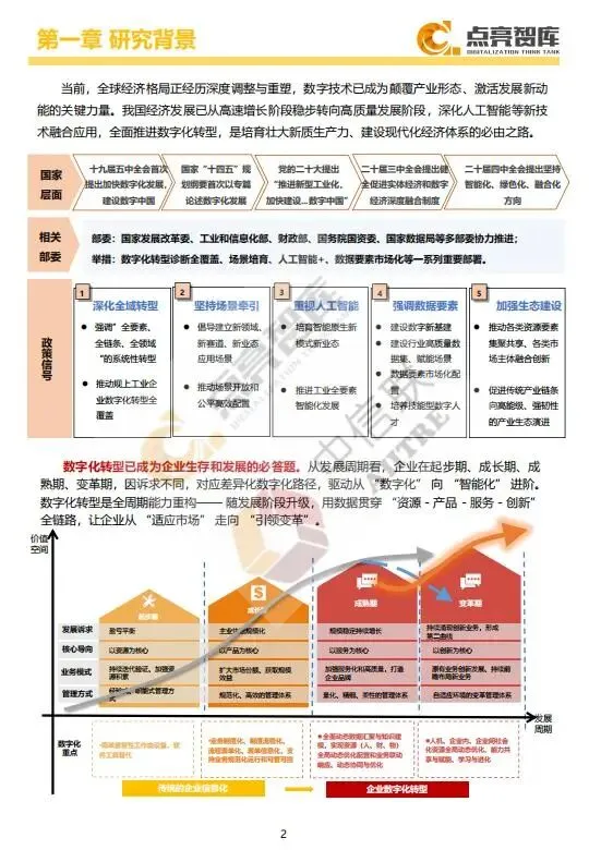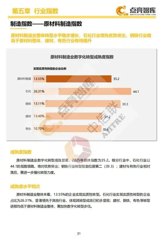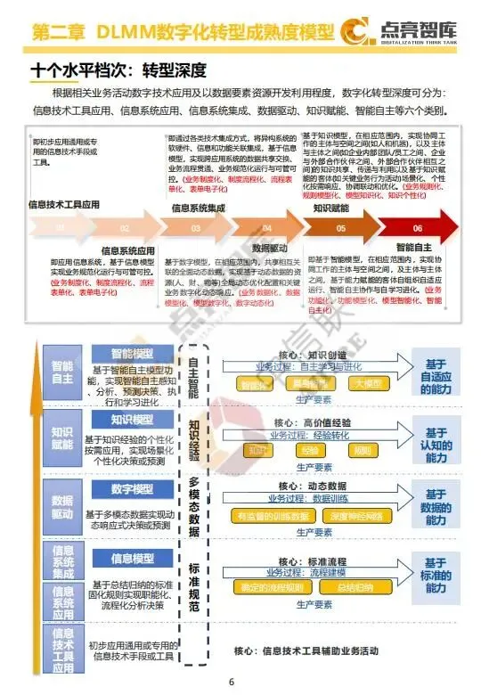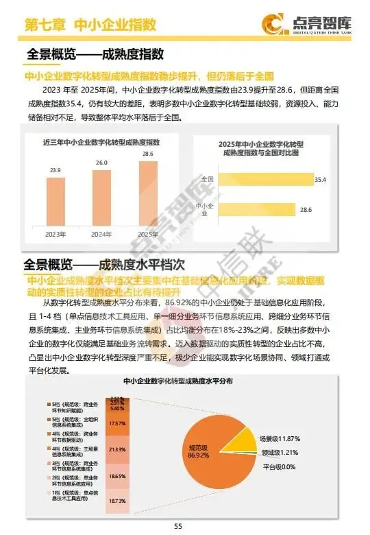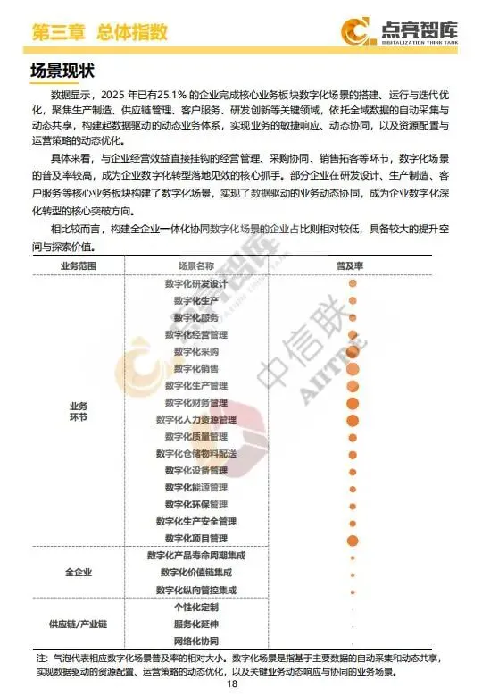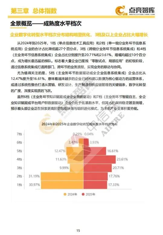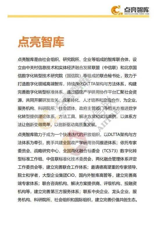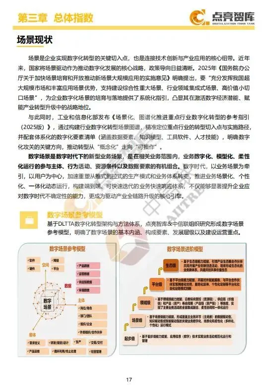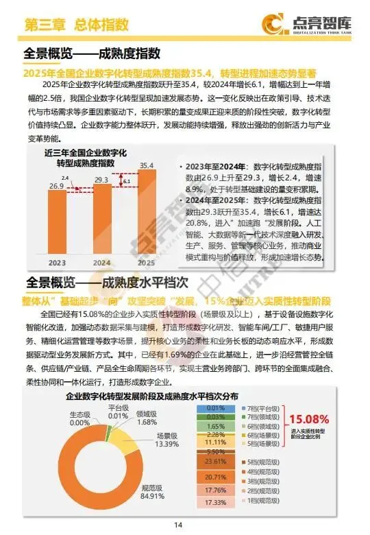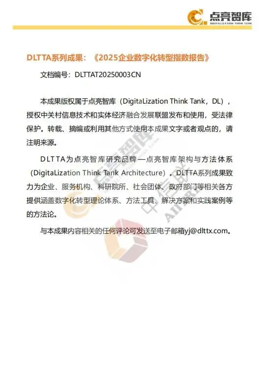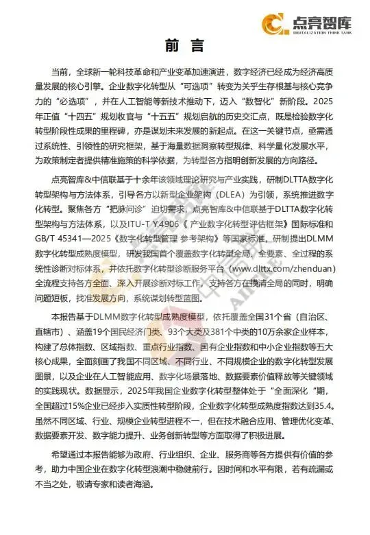 2025年,企业数字化转型进入全面深化阶段。随着新一轮科技革命和产业变革加速推进,数字经济成为推动经济高质量发展的核心动力。企业数字化转型已从“可选项”转变为关乎生存与竞争力的“必选项”,在人工智能等新技术驱动下,迈入“数智化”新阶段。报告基于DLMM数字化转型成熟度模型,结合全国31个省(自治区、直辖市)、涵盖19个国民经济门类、93个大类及381个中类的10万余家企业样本,构建了总体指数、区域指数、重点行业指数、国有企业指数和中小企业指数五大核心成果,系统呈现我国企业数字化转型的发展现状与趋势。2025年我国企业数字化转型整体处于“全面深化”期,超过15%的企业已进入实质性转型阶段。企业在人工智能应用、数字化场景落地、数据要素价值释放等关键领域展现出积极实践态势。通过系统性研究框架,报告旨在揭示数字化转型规律,科学量化发展水平,为政策制定提供依据,为企业转型提供方向指引。报告依托DLTTA数字化转型架构与方法体系,以及ITU-T Y.4906国际标准和GB/T 45341—2025国家标准,构建了覆盖全要素、全过程的诊断对标体系,支持企业全面掌握自身转型状态,识别短板,明确发展方向,系统规划转型路径。
