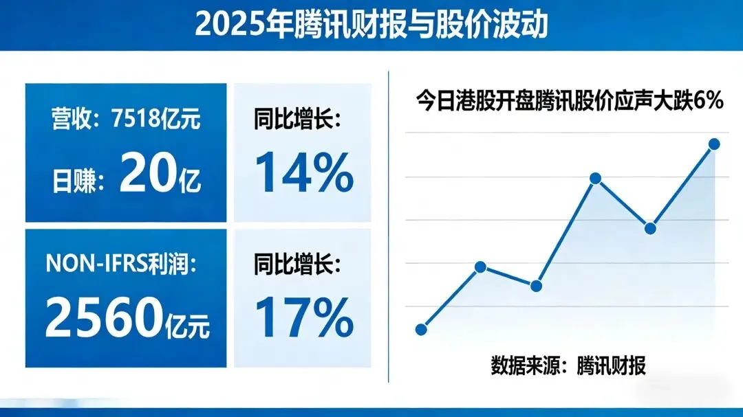 2025年财报季,腾讯奉上一份堪称亮眼的答卷:营收7518亿元,日赚20亿,同比增长14%;NON-IFRS利润2560亿元,同比增长17%。然而,这份超出市场预期的财报发布后,今日港股开盘腾讯股价却应声大跌6%。