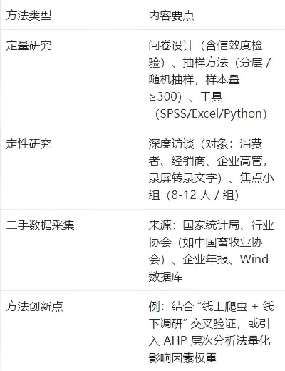 4. 研究目标与问题:明确 3-5 个核心问题(例:“某地区消费者对功能性食品的支付意愿及影响因素”)