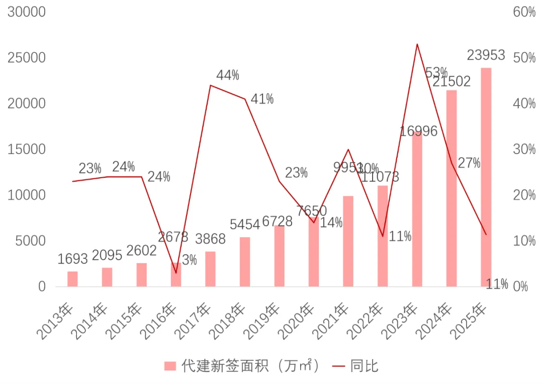 2025年,代建企业新签拓展难度显著提升。根据亿翰监测数据,2025年全国代建新增建筑面积突破2.3亿㎡,在高基数下仍保持11%的同比增长,但较2024年27%的增速进一步回落16个百分点,行业从高速扩张进入稳健增长新阶段。