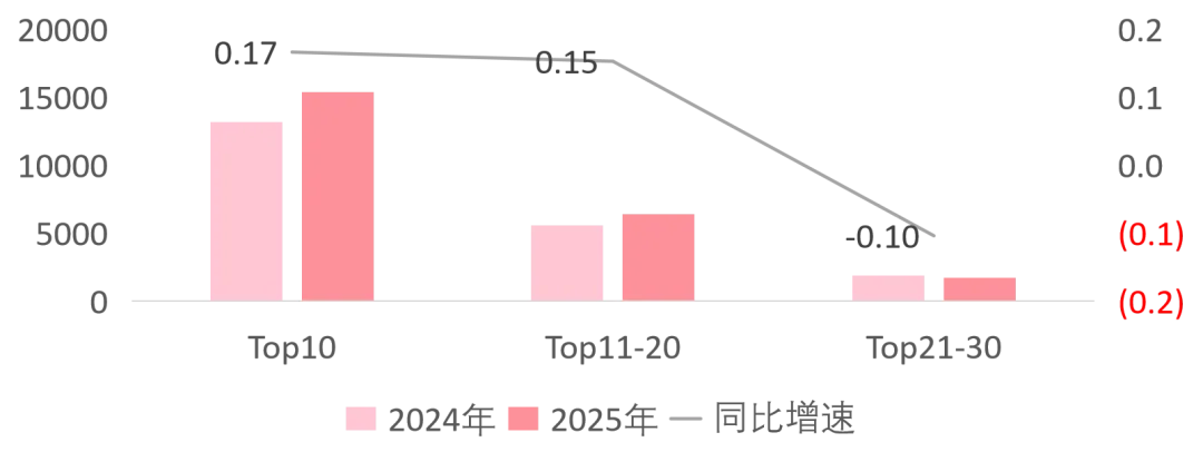 市场集中度结构性分化,TOP5代建商的集中度为40%,较2024年下降1.4个百分点,TOP10企业新签面积合计15379万平方米,占总建面的64%,份额基本维稳,仍是行业增长核心引擎,其17%的同比增速显著跑赢行业平均;TOP11-20企业增速回落至15%;TOP21-30企业则出现负增长(同比-10%),行业“马太效应”进一步凸显,尾部企业生存空间持续收窄。