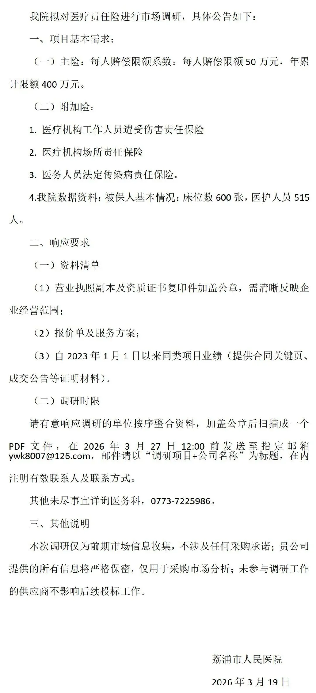 荔浦市人民医院医疗责任险市场调研公告