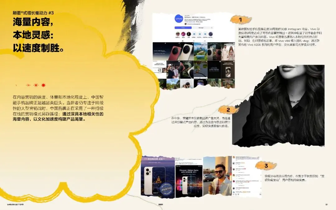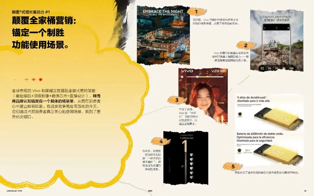全球市场的Vivo和荣耀,正在摆脱全能式营销策略(最佳续航+顶级影像+最快芯片+至臻设计),转而将品牌认知锚定在一个具体的场景里,从而在消费者心中建立鲜明印象。