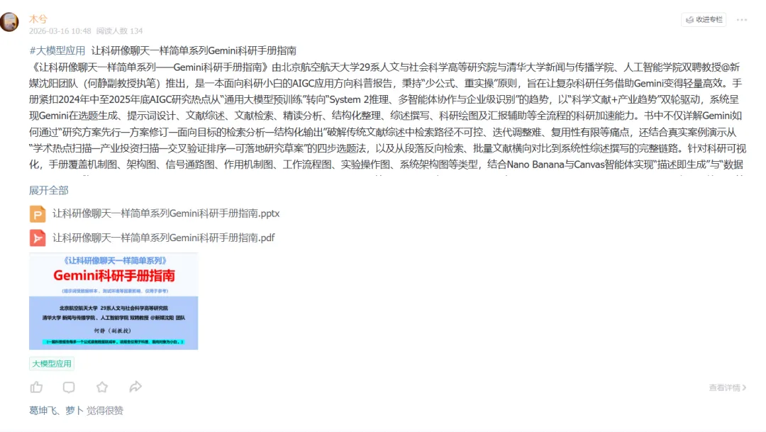 《让科研像聊天一样简单——Gemini科研手册指南》是一本面向科研初学者与跨领域研究者的实用型人工智能辅助科研手册。本指南由清华大学新闻与传播学院、人工智能学院双聘教授@新媒沈阳团队与北京航空航天大学何静副教授共同编撰,旨在通过通俗易懂的科普方式,介绍如何运用以Gemini为代表的大语言模型,系统性提升科研工作的效率与质量。