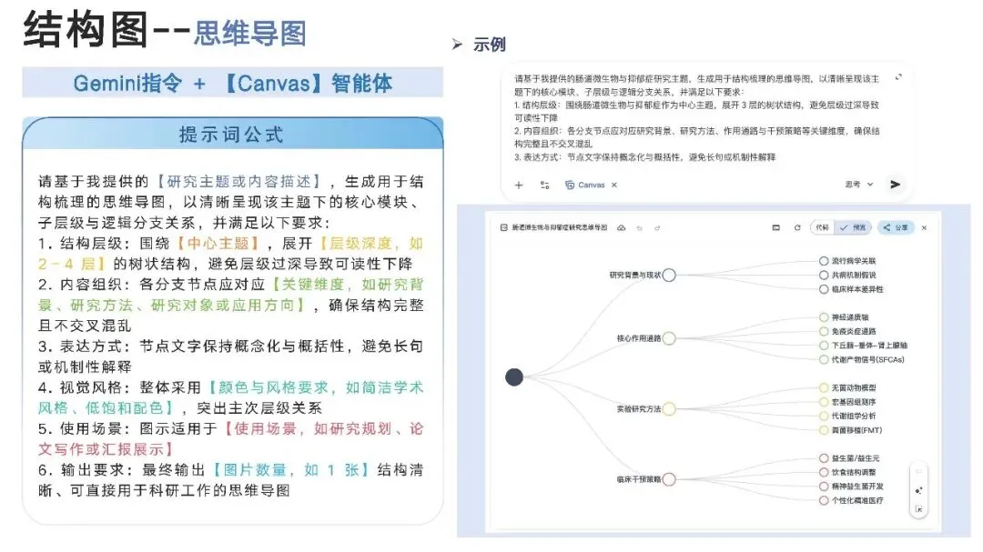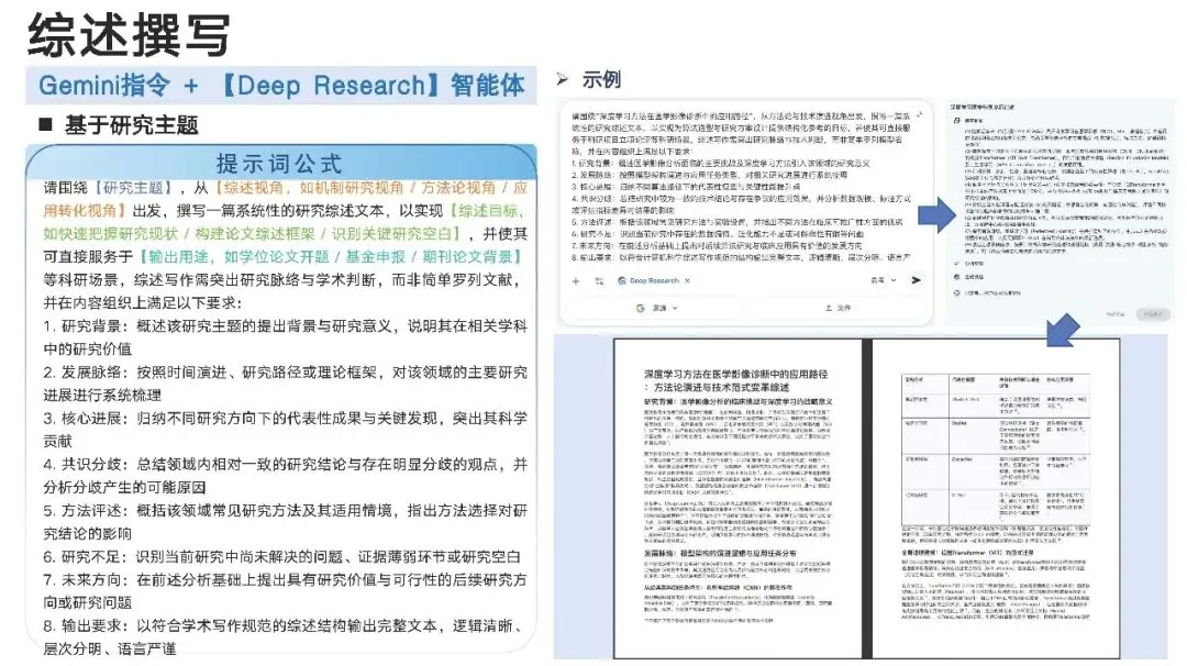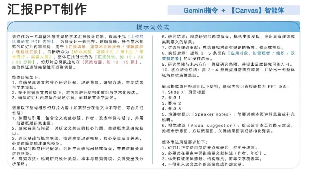手册围绕“选题生成—文献检索—文献精读—综述撰写—科研绘图—学术汇报—代码编写—智能体搭建”等全链条科研任务,提供了结构化、可操作的提示词公式与智能体调用方法。其核心特色在于: