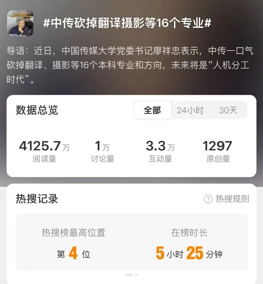高校裁撤专业并不是新鲜事,但最近“中传砍掉翻译摄影等16个专业”登上热搜,再次引发大家对AI以及传媒类专业的关注。