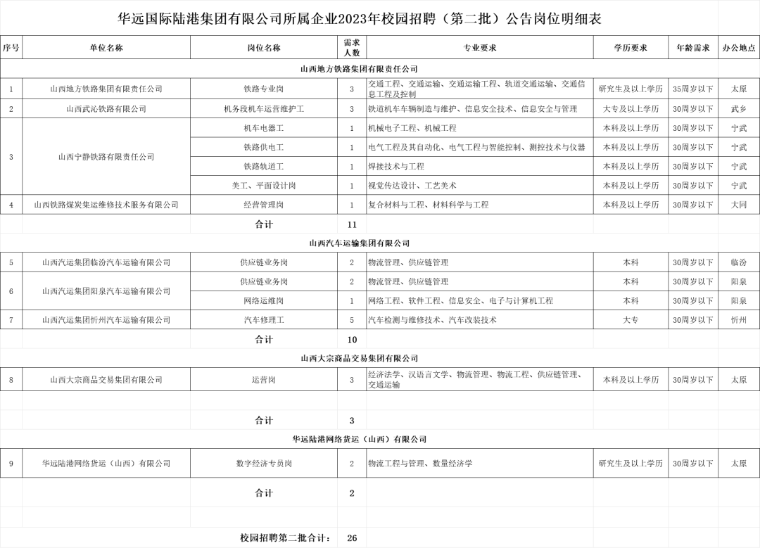 具体岗位需求、学历要求、专业要求,详见《华远国际陆港集团有限公司所属企业2023年校园招聘(第二批)公告岗位明细表》。