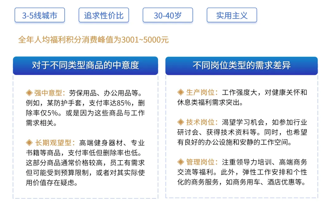 1、选择超载理论:福利选项过多会增加决策成本,引发选择疲劳,降低满意度。建议精简 SKU,精准供给,避免过量选择导致体验下降。搭建积分平台,提供个性化选择的机会。