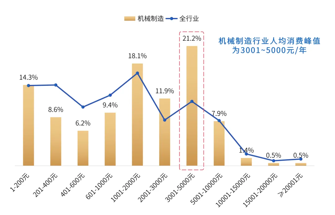 机械制造行业员工全年福利积分消耗集中在1001–5000 元总额区间,其中3001–5000 元档位占比最高,达21.2%。建议企业可围绕1001–5000元这一主力总额区间,规划年度积分发放。