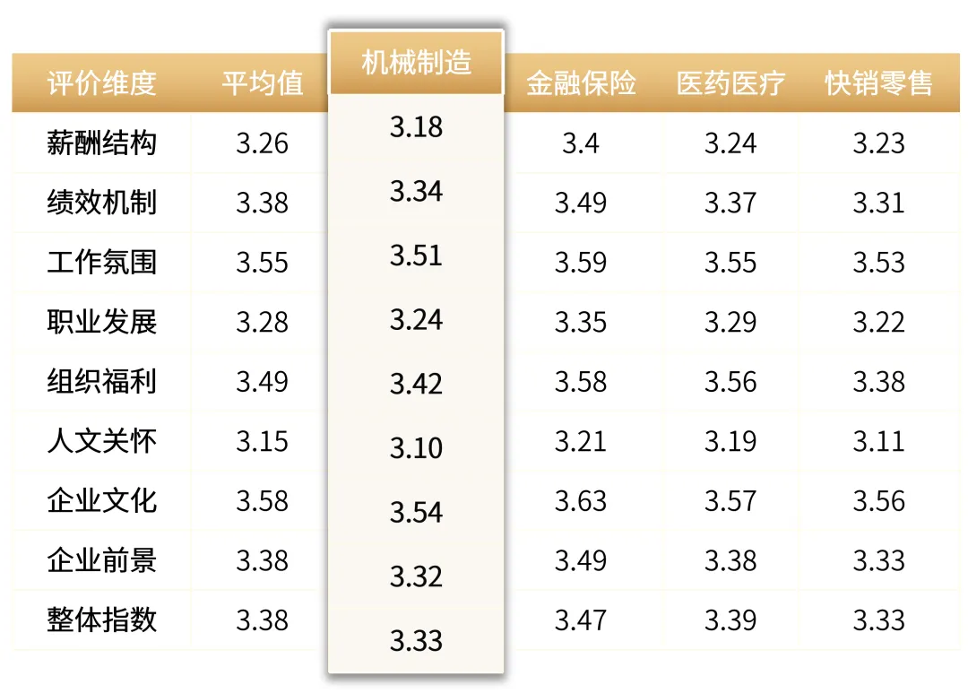机械制造行业在经济下行、竞争加剧背景下,将有限资源优先投入“保生存”,导致员工对企业前景缺乏信心、难以感受组织关怀。该行业在薪酬结构、工作氛围、人文关怀、企业文化等多个维度上的得分明显低于均值/其他行业。