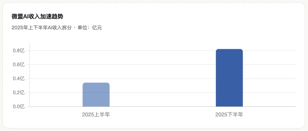 微盟选择了"广度优先"。接入DeepSeek、混元、通义千问等10余款大模型,上线WAI、WAI Pro、WIME、AI Work365等产品矩阵。WIME轻量建店工具在微信小店和小红书落地,累计用户超51万,活跃用户同比激增442.7%。2025年AI相关收入1.16亿元,占总营收7.3%,且下半年加速明显——上半年0.34亿,下半年0.82亿,节奏在提速。