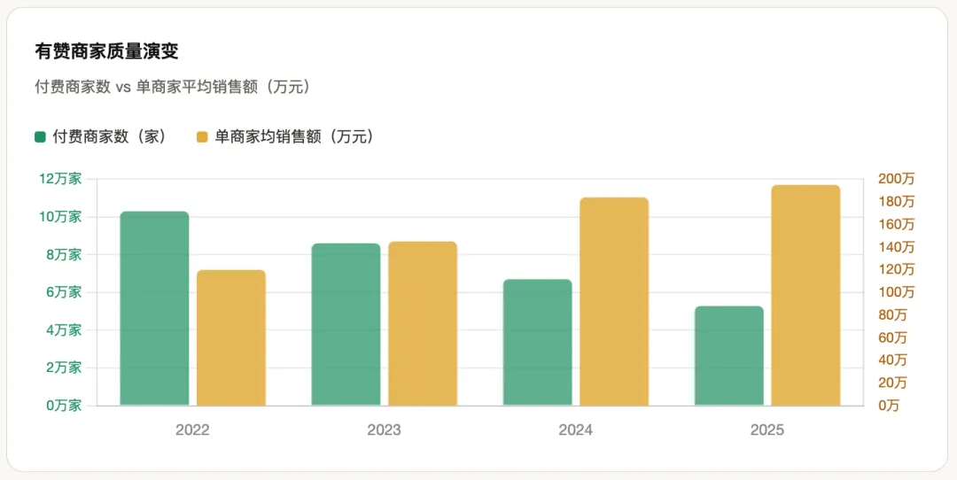 有赞付费商家数量从高峰期超过10万家,降至2025年底的52,809家,几乎腰斩。但别急着唱衰:单个商家平均销售额195万元,同比增长6%;中大型商家续费率68%,整体续费率从2021年的40%提升至57%。
