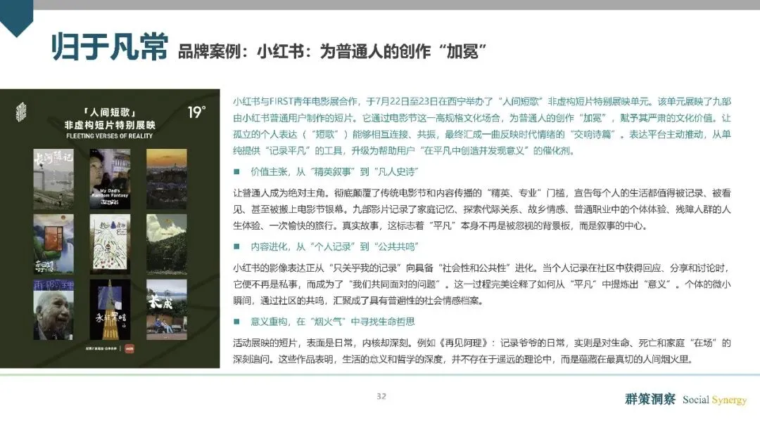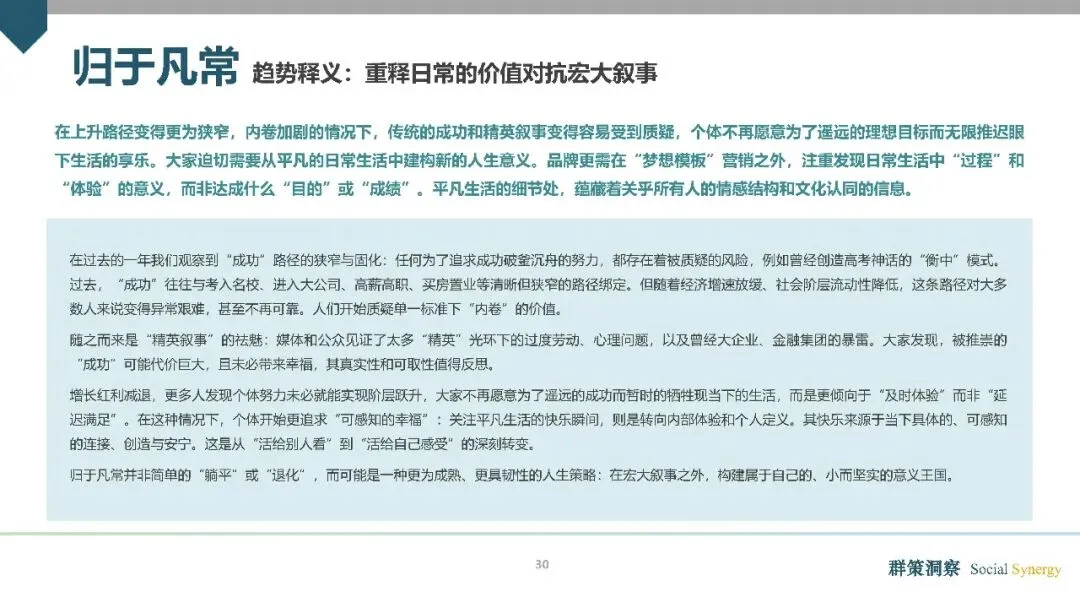 人们从延迟满足,转向了对当下体验的重视,开始在平凡的日常生活里,建构属于自己的人生意义。消费的重心也随之发生了根本的转移。品牌不再需要为消费者打造一个遥不可及的梦想模板,而是要看见并尊重普通人真实的生活。消费的意义,不再是为了抵达某个成功的终点,而是为了丰富当下的过程。