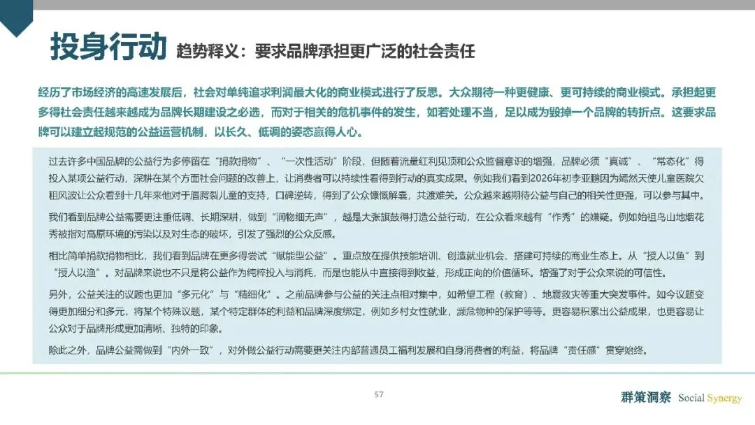 消费者对品牌社会责任的要求,早已过了捐款捐物、一次性事件营销的阶段。公众对品牌公益的鉴别力越来越高,大张旗鼓的作秀式公益,只会引发强烈的公众反感。消费者期待的,是品牌能把社会责任融入自身的商业模式,进行长期、低调、务实的深耕。