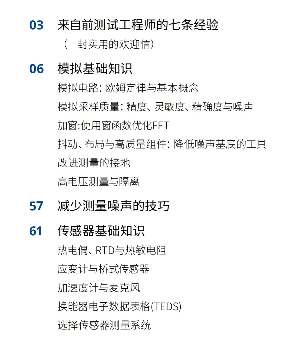 在核心理论板块,该指南从模拟电路基础到采样质量关键概念,从 FFT 原理与加窗技术选型,到噪声基底构成与降低方法,把抽象的理论讲透,让你吃透 DAQ 底层逻辑。