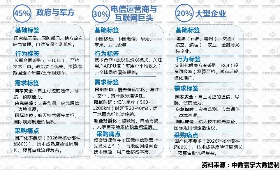 核心客户占比 95%,包括政府与军方30%、电信运营商与互联网巨头45%、大型企业20%。政府与军方聚焦国家安全、应急保障、国际地位,采用长期合同采购,痛点为国产化率要求高、技术验证周期长、预算审批复杂;电信运营商与互联网巨头侧重网络补盲、降低时延、新业务孵化,通过技术合作 + 股权投资布局,痛点是频谱资源争夺、地面网络融合难、用户迁移成本高。大型企业关注定制化解决方案,严格测算投资回报率,痛点与政府客群类似,国产化和技术验证要求高。