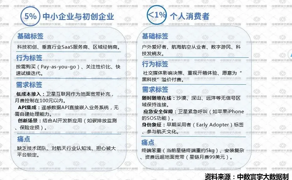 潜力客户占比 5%,包括中小企业与初创企业4%、个人消费者1%。中小企业与初创企业按需采购,关注性价比,需求为低成本接入、API 集成,痛点是缺乏技术团队、行业认知浅、担心平台锁定。个人消费者受社交媒体影响,愿意为黑科技溢价,需求为随时随地在线、应急安全保障、身份象征,痛点是终端笨重、安装复杂、资费远高于地面宽带。